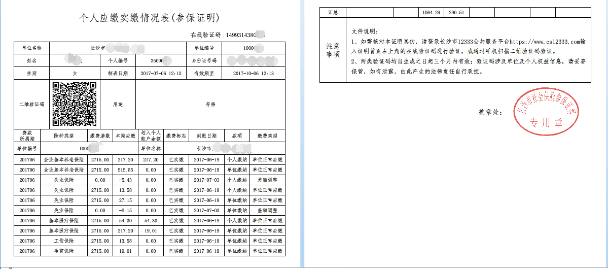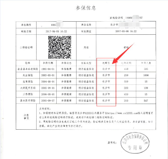 - 在長沙市人力資源和社會保障局官網打印的個人參保信息記錄證明和單位參保信息記錄證明,兩個證明社保編號需一致,單位參保信息記錄證明中“統籌區”需為“長沙市”。(樣板見下)