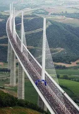 如果你恐高的話,就不要去米約(Millau)大橋。此大橋跨越馬希福中央山脈的上方,橋面高出地面270米。如果加上斜拉索的高度,則大橋高出地面343米,最高點比埃菲爾鐵塔還要高23米,堪稱世界最高的大橋。