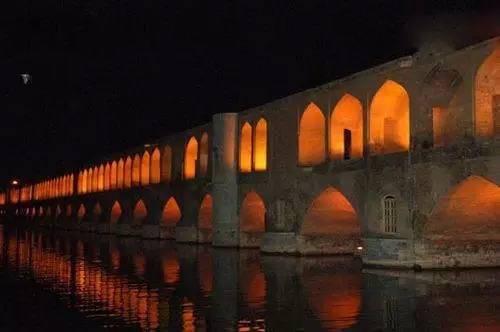 這座橋建在伊朗的伊斯法罕,由Shah Abbas II(伊朗王二世)建成于17世紀。它既是一座橋,也是一座壩。當橋洞封閉時,橋兩側的水位便會產生變化。橋有兩層拱隆,采用不同顏色的地磚區分開。在橋 中央,還有兩個很大的亭子,叫做國王會客廳。這座宏偉壯觀的靚橋橫跨在Zayandeh河上,是伊朗最有名的大橋之一。