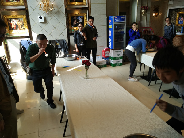 游戲規則:用嘴巴含住吸管吸氣,將10個乒乓球從a盆移入b盆,a盆、b盆相距4米,移動過程中雙手不能碰球,否則犯規不算,要重新移取。最先移完10個球一方獲勝(水杯)。